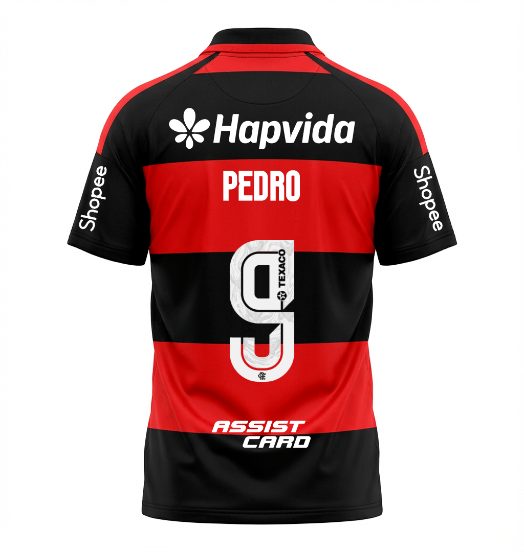 O tradicional rubro-negro segue imponente, refletindo a identidade do Flamengo que entra em campo para vencer. O escudo do CRF no peito carrega a história e a paixão da Nação, enquanto os patrocínios oficiais compõem o visual utilizado nos jogos. Nas costas, o 9 de Pedro representa eficiência, posicionamento e gols que decidiram partidas importantes.