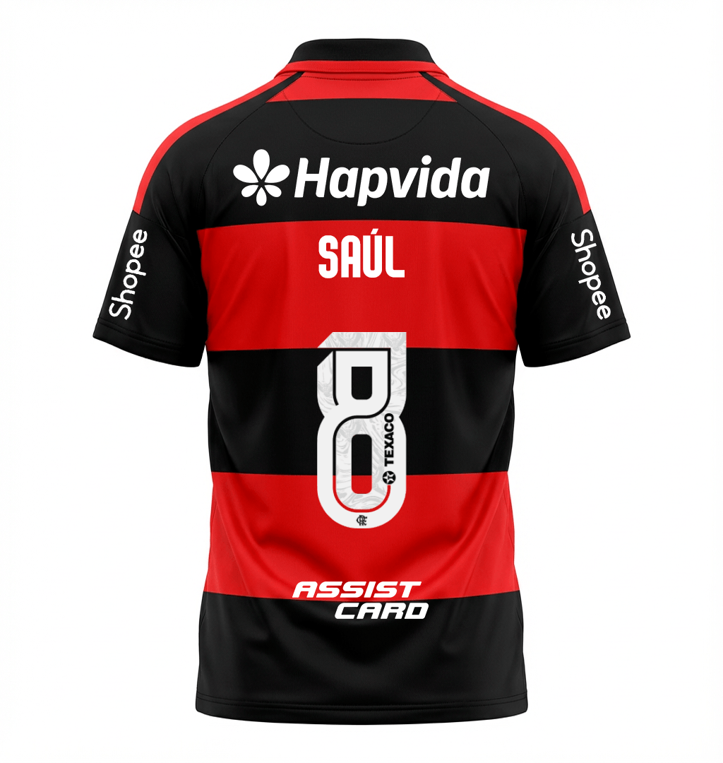 O tradicional rubro-negro segue como símbolo máximo da identidade do Flamengo. No peito, o escudo do CRF carrega a história e a grandeza do clube, acompanhado dos patrocínios oficiais que compõem o visual utilizado em campo. Nas costas, o 8 de Saúl traduz dinamismo, intensidade e presença constante nas duas fases do jogo.